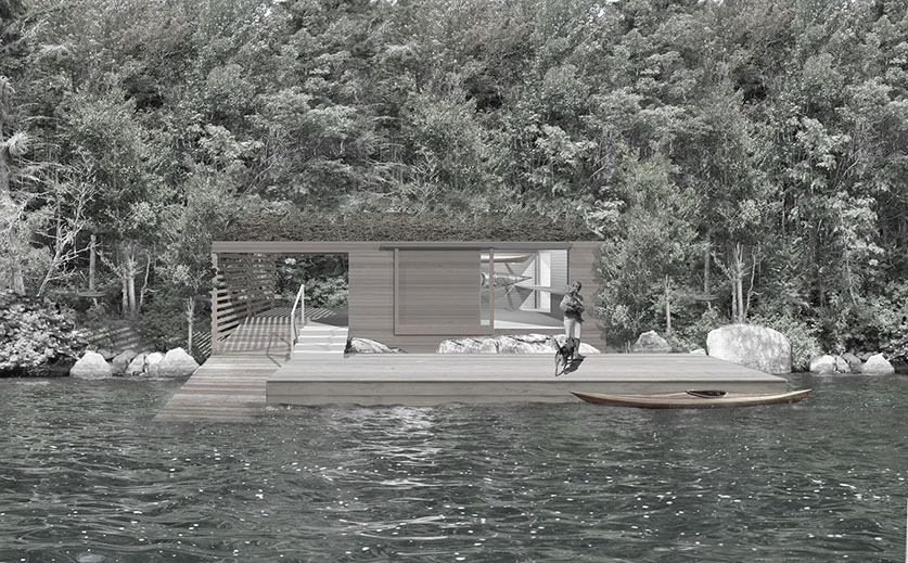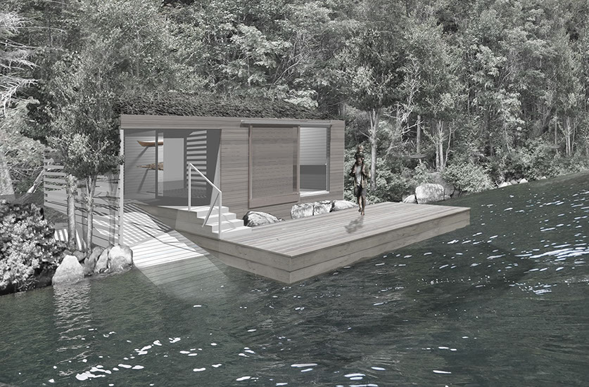 This new Boathouse is situated lakeside on a heavily wooded lot in the Adirondack State Park. A supporting structure to the Lake Camp, the basic building structures are wood clad timber frame. Light building assembly and foundation requirements reflect that all materials and labor must be brought to the site by relatively small trailer-able boats. Only materials in their rawest serviceable form, from as near to the site as is possible, will be used in this construction. Occupancy is seasonal and access is by boat.