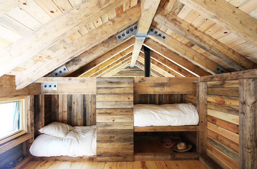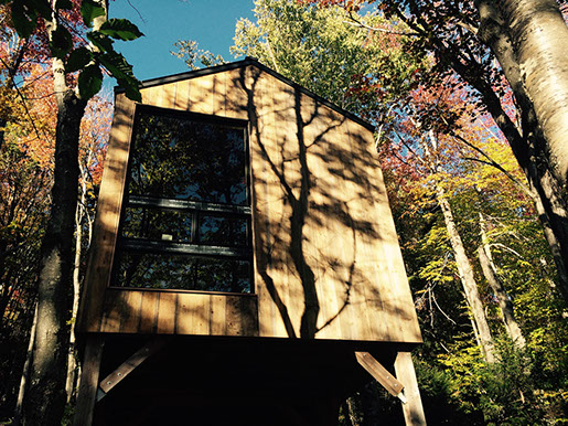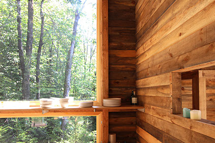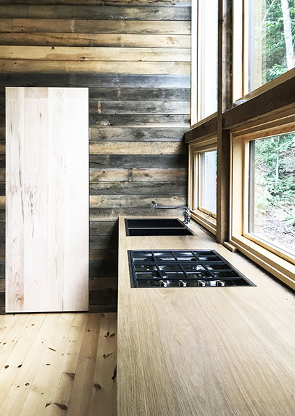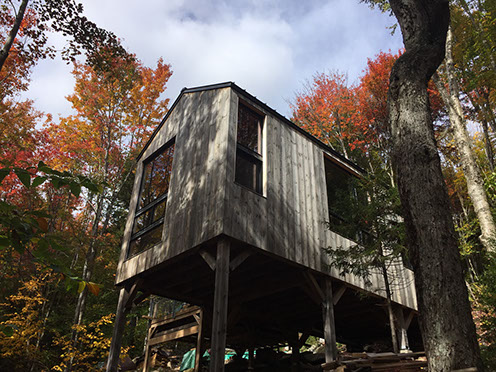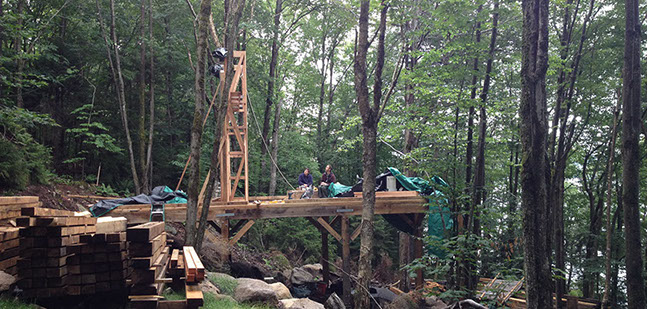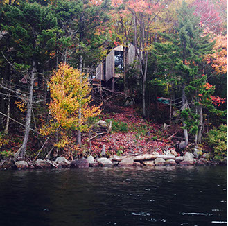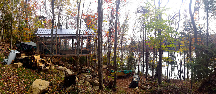 This new ‘Camp’ is situated lakeside on a heavily wooded lot in the Adirondack State Park. An organization concept of elevated buildings connected by raised paths references a traditional Adirondack camp’s many dedicated service buildings united by forest paths. The basic building structures are wood clad timber frame. Light building assembly and foundation requirements reflect that all materials and labor must be brought to the site by relatively small trailer-able boats. Natural light is paramount as this camp is off-grid and has no electricity. Only materials in their rawest serviceable form, from as near to the site as is possible, will be used in this construction. Occupancy is seasonal and access is by boat.